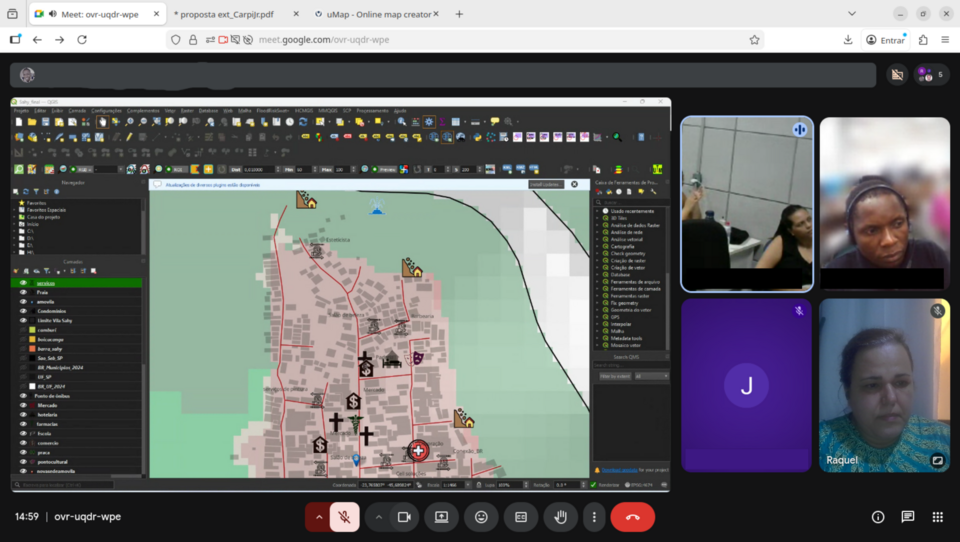 Oficinas de mapeamento temático com OpenStreetMap abordaram pontos de interesse (POI), cursos d’água (waterways), redução de riscos de desastres (RRD) e cobertura vegetal.