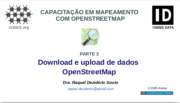 Vídeo e áudio, que apresentam a parte 3 do curso, com explicação sobre os principais meios para realizar o download e upload dos dados OpenStreetMap.